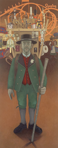 He has painted himself as an itinerant toy merchant, who carries his cultural bagage on his back. Although dressed in typical Bavarian costume, including lederhosen, a painting of a toy alien among his wares suggests he is not the pure German he seems.